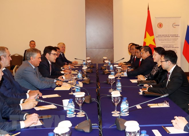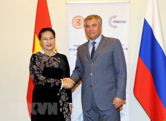 Bên lề Hội nghị Chủ tịch Quốc hội Á Âu lần thứ 3 (MSEAP 3) tổ chức tại thành phố Atalyta của Thổ Nhĩ Kỳ, chiều tối 8/10 (theo giờ địa phương), Chủ tịch Quốc hội Nguyễn Thị Kim Ngân đã hội kiến với Chủ tịch Duma Quốc gia (Hạ viện) Liên bang Nga Vyacheslav Volodin.