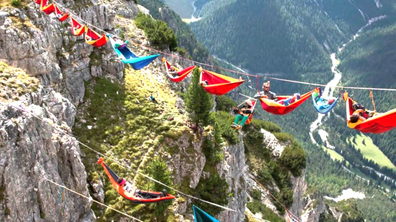 Được tổ chức lần đầu vào năm 2012, Lễ hội quốc tế Highline ở Monte Piana, Italy thật sự chỉ dành cho những ai muốn trải nghiệm cảm giác mạnh. Không phải tất cả mọi người đều thoải mái khi nằm trên võng, được xâu thành từng chuỗi, cao đến hơn 2.200m so mực nước biển. (Ảnh: Youtube)